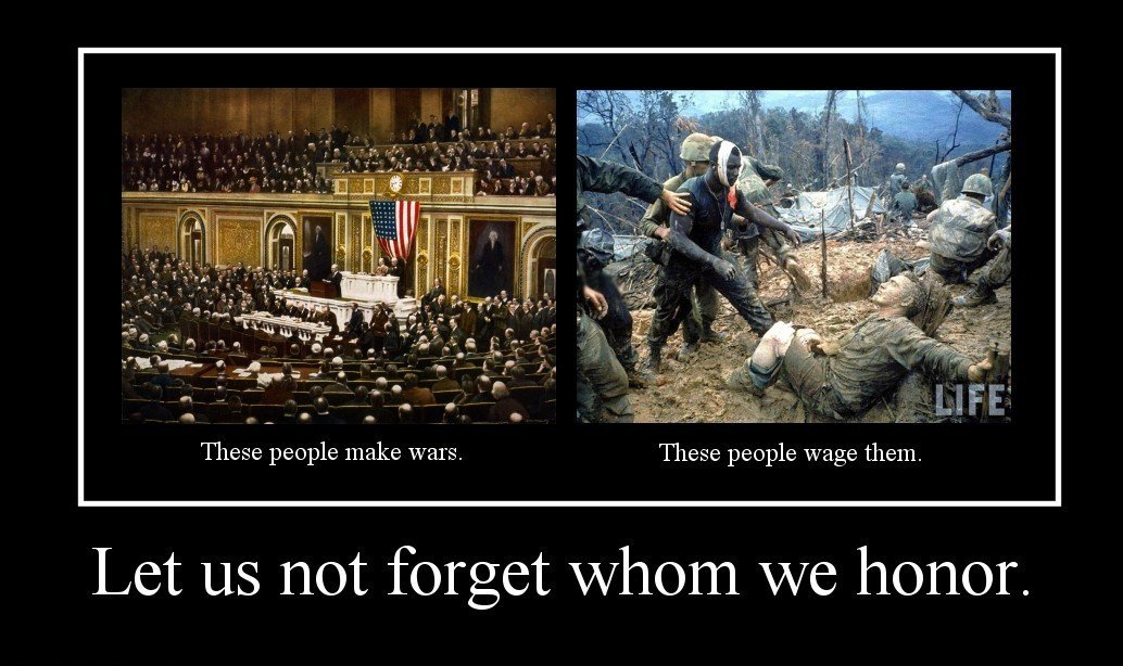 Every nation has its wars, and every war has its soldiers; some volunteer, but most are drafted. The vast majority of those who fight and die in national conflicts have little idea what they are really fighting for, but they put the uniform on and fight just the same. For their sacrifice and their willingness to serve, we honor them, and that honor has very little to do with patriotism, and nothing to do with nationalism; it has only to do with respect for their stalwart bravery, and the ongoing sacrifices made by the families of those who never came home.