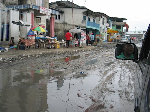 Drove into one of the real backwater quarters of Kinshasa. With the four-wheel drive, we drove over roads that would have made Indiana Jones quail in terror. Everywhere: mud, mud, mud, garbage, and more mud, mosquito havens in road ruts the size of canyons, absolute squalor everywhere. It was like something out of a bad dream. Hordes of little boys running along the side of the car shouting “White man!” in their native language, big tubs of fufu (manioc powder) for sale everywhere, chickens and ducks roaming the streets, and in the midst of all the wretchedness, people buying and selling, trading and walking, bartering and dickering, visiting and playing, incredible disorder.