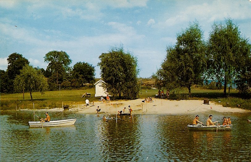 The boating pond with one of the beaches; in boat at left, Charles Martens who was a counselor there in 1957.