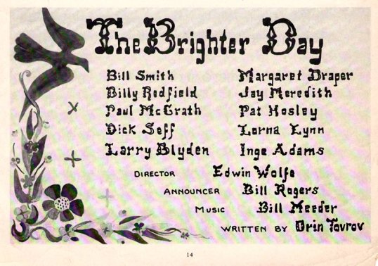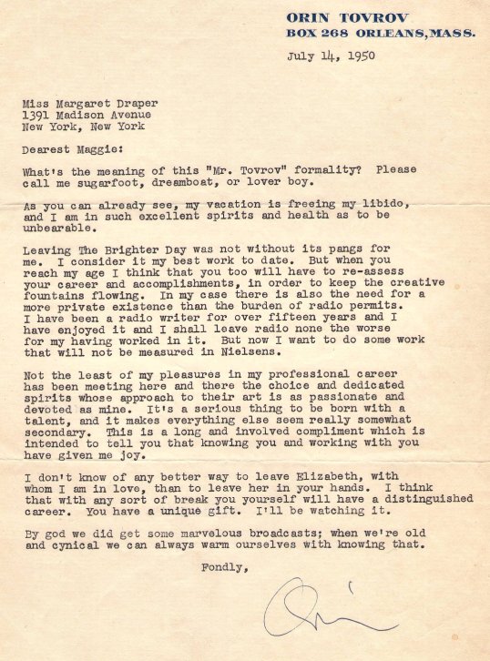 The writer of Brighter Day for many years, Orin Tovrov, had a special fondness for Margaret, and vice versa. Here’s a letter Orin wrote to Maggie on the occasion of his leaving Brighter Day in 1950: