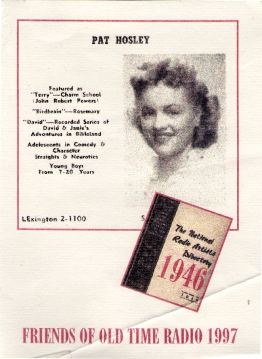 Great post! I think you have miscaptioned one of your photos, though. The photo you have captioned “a later still of Pat Hosley” is actually a photo of the wonderful Charita Bauer, star of “The Guiding Light” and other radio serials.