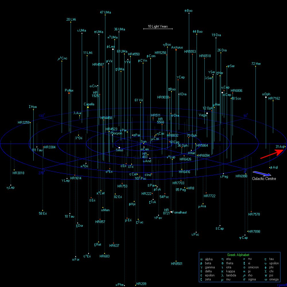 The Void has always fascinated me. I can remember being 11 or 12 years old, lying on my back with a friend on Fire Island, holding flashlights we had acquired at Ringling Brothers’ Barnum and Bailey Circus at Madison Square Garden, and shining our beams up into the sky, wondering if the light would go on forever and ever. Assuming nothing got in the way, anyone with sensors strong enough on a planet circling 31 Aquilae (49.5 light years away) might detect a few of our photons right about now.