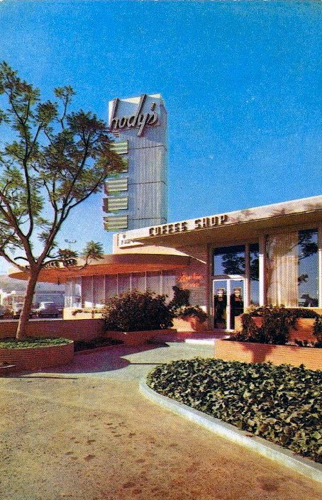 In 1949, Sidney Hoedemaker founded Hody’s Restaurant Inc. (Hody – as in Hoedemaker). Hoedemaker’s restaurants were all about service, efficiency, cheerfulness and courtesy. One was always greeted with a smile. The Hody’s at 3553 La Brea (at Rodeo) featured expanded service, circular drive-in and a sign pylon rising from the roof was designed by Wayne McCallister.