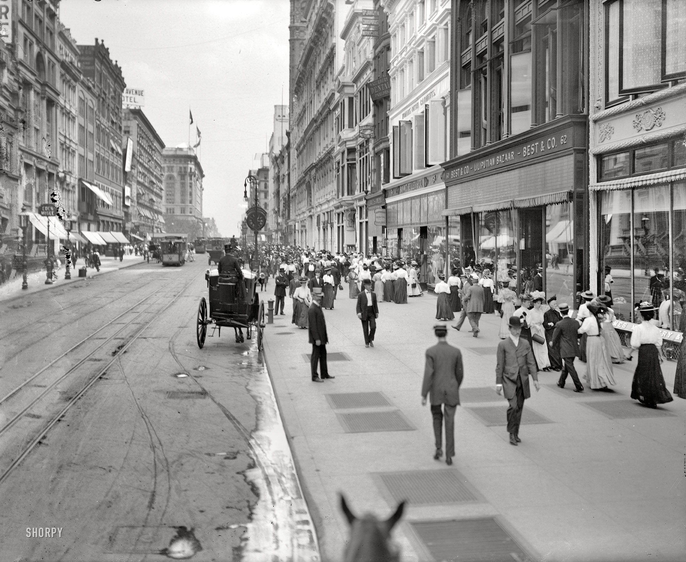 “West 23rd Street.” Home to Best & Co’s “Lilliputian Bazaar,” Bonwit Teller (“Women’s Outer Garments”), Waterbury Dental Parlors and Eden Musee. 8×10 glass negative, Detroit Publishing Co.