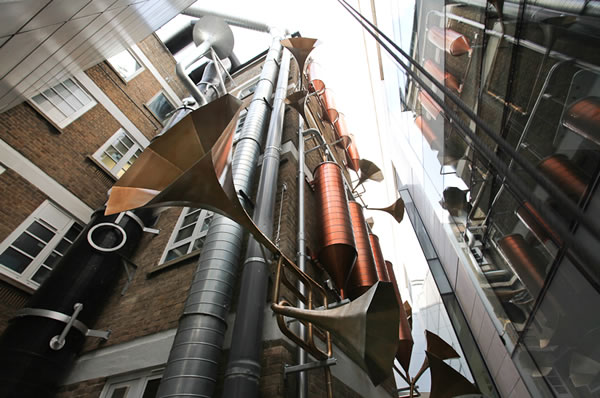 An architectural project, a secret garden of music and healing, dwells in an unlikely space between London’s Great Ormond Street Hospital and a neighboring building. It looks like Animusic crossed with the Pompidou museum in Paris, sounds like the Swingles on magic mushrooms and accompanied by a chorus of angels; and feels as though Agatha Heterodyne had landed on Pandora and tried to recreate the world of Alice in Wonderland.