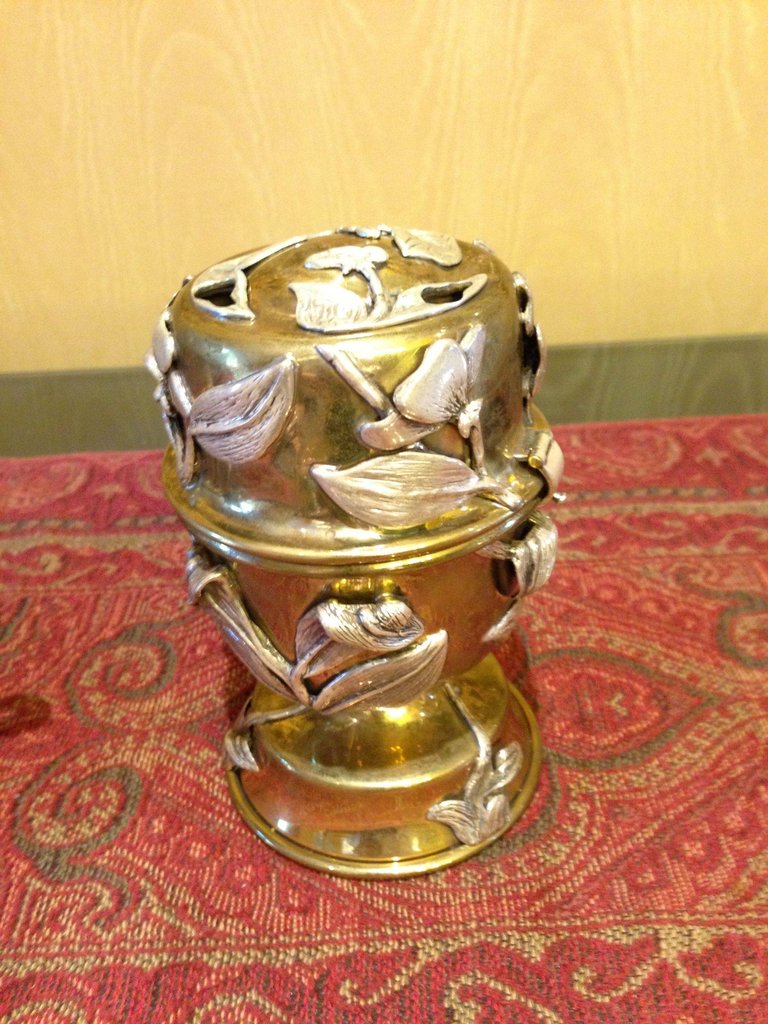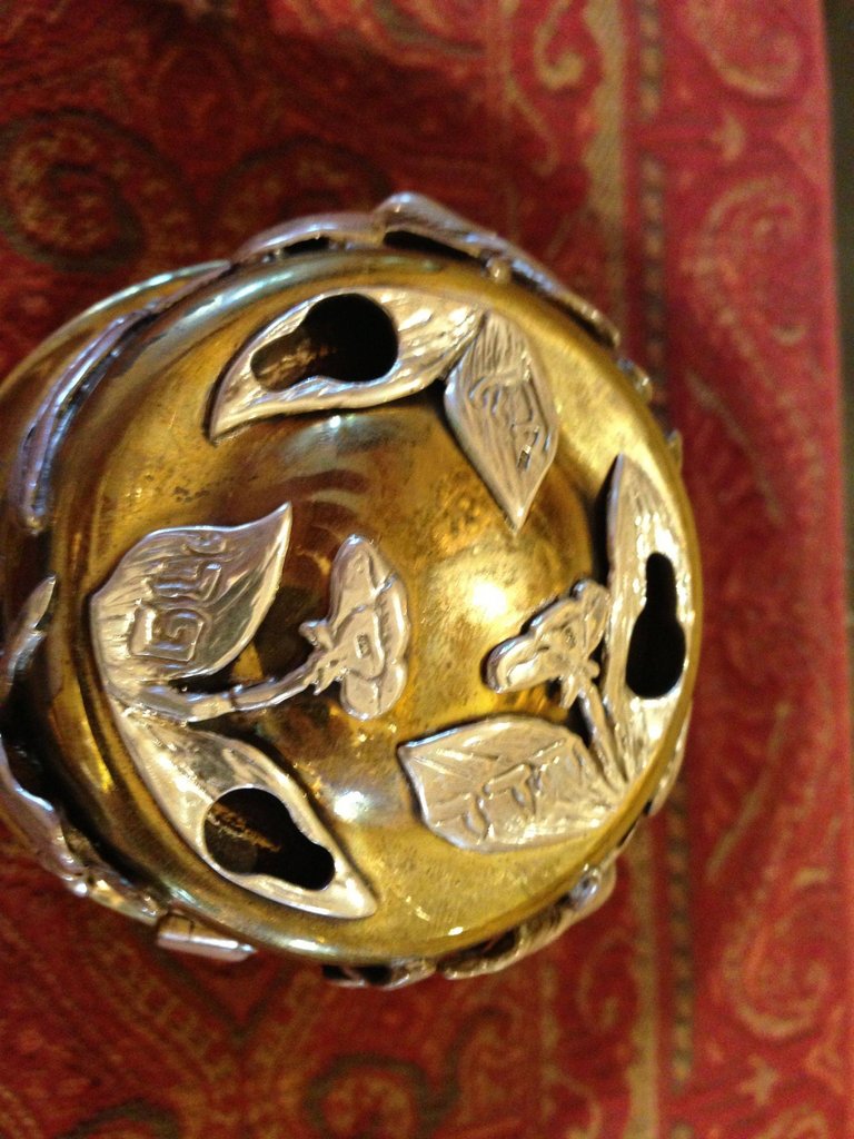 The main body is designed to hold an etrog, the yellow citron or Citrus medica used by Jews on the week-long holiday of Sukkot.