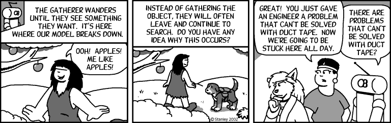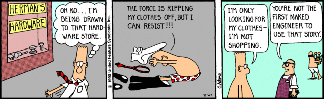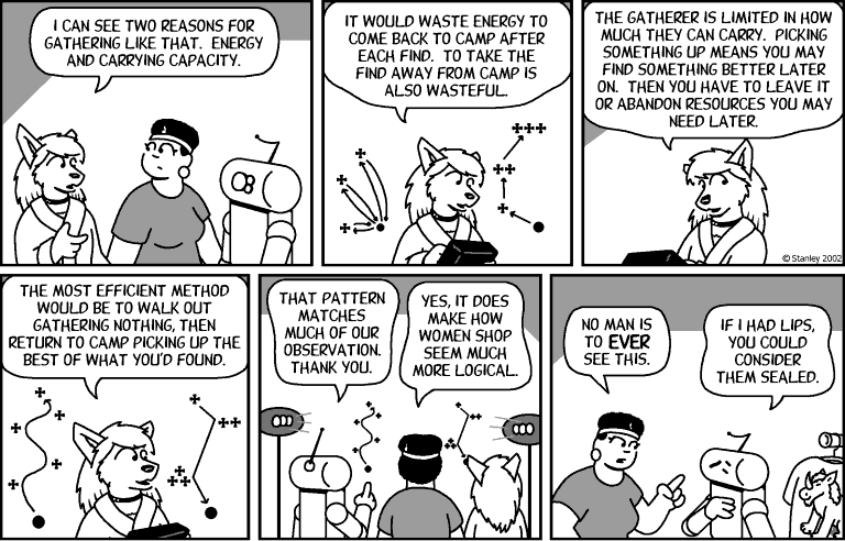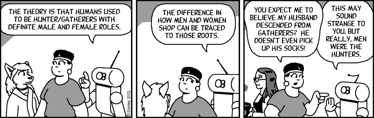 A friend of mine, Mark Stanley, author and illustrator of the webcomic Freefall, came up with what seems like a very cogent explanation for the difference in shopping patterns, at least from an energy-conservation standpoint. In this scene, Florence Ambrose, a gengineered wolf (and an engineer in her own right) is shopping for clothes, when this interaction takes place: