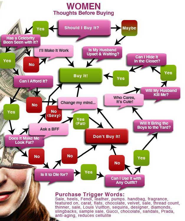 This makes a lot of sense; there’s even science behind it. Of course, it doesn’t touch the psychological differences between men and women, or how they tend to think; have a look at these two representations of the shopping decision process (click them for larger versions):