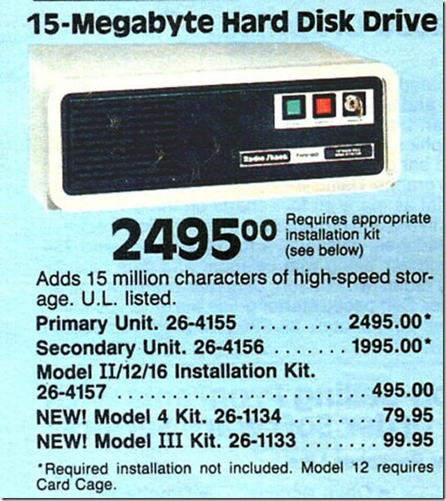 Whereas a 15 Megabyte Hard Drive would set you back $2495.00… plus $495.00 for that “required installation kit.”