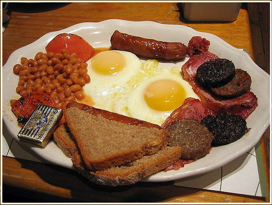 Sausages, bacon, eggs, grilled tomato, mushrooms, bread, black pudding and baked beans. Knocked back with a cup of tea.