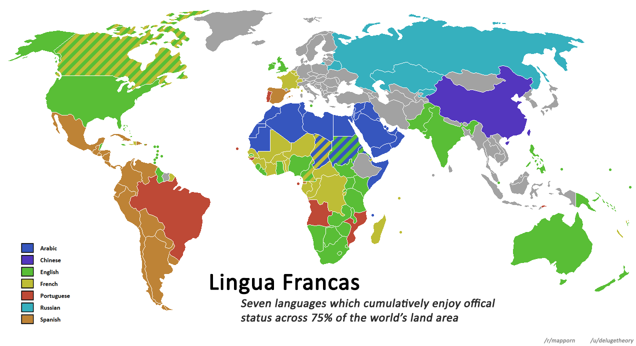 In addition, here’s a map showing how linguae francae, or “portmanteau languages”, are distributed across the globe; one can see the broad reach of the top seven.