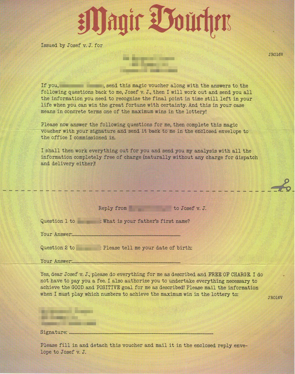 At any rate, the letter is full of the typical handwavium and orange smoke about mystical powers, good luck forthcoming, millions of dollars to be won, but instead of money, this Josef v. J. drone just wants a few pieces of critical information so he can “work everything out correctly on your behalf”: your father’s first name, your date of birth, and your signature. With those pieces of information, you have (if you’re Mr. or Mrs. average American) opened the door to most of your financial accounts.
