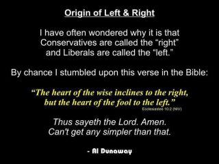 A further disconnect of the biblical usage with modern politics arises when we realize that current usage of left and right began with the French revolution; Wikipedia states that “The terms ‘left’ and ‘right’ were not used to refer to political ideology but only to seating in the legislature.”