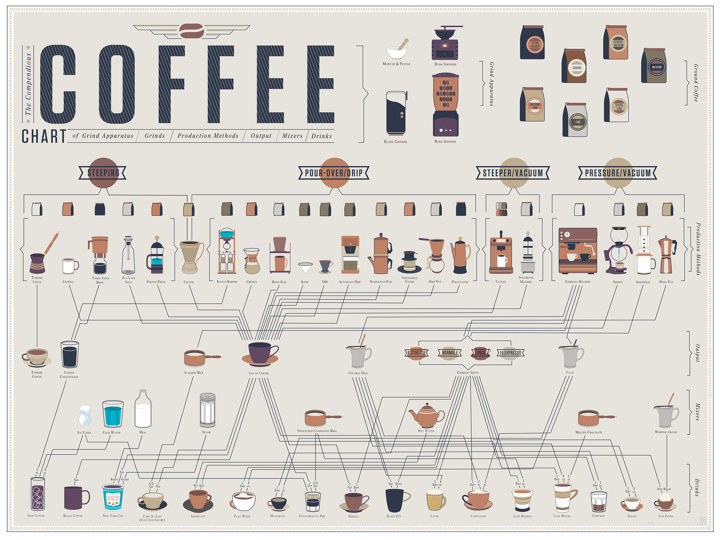 [The] coffee Chart lays out the entire coffee ecosystem, outlining how various methods of production, including the French press, Kyoto dripper, and Neapolitan flip, among others, are used to create coffees, cortados, cappuccinos, and more. Coffee devotees can use the graphic as a way to announce their allegiance to the coffee bean in all its manifestations. For newcomers, it’s a chance to discover that it’s not actually called a “cafe olé.”