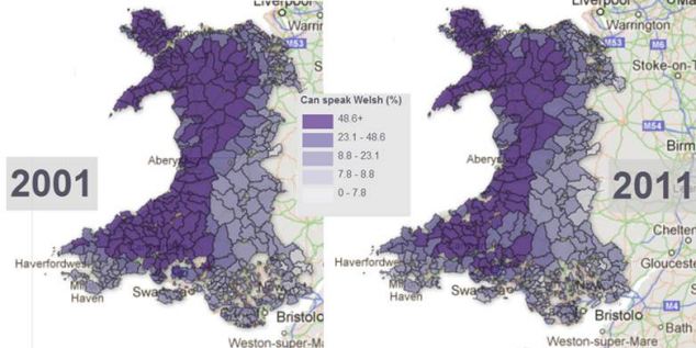 The above map shows the changing percentage of those who claim to speak Welsh over the period of 10 years.