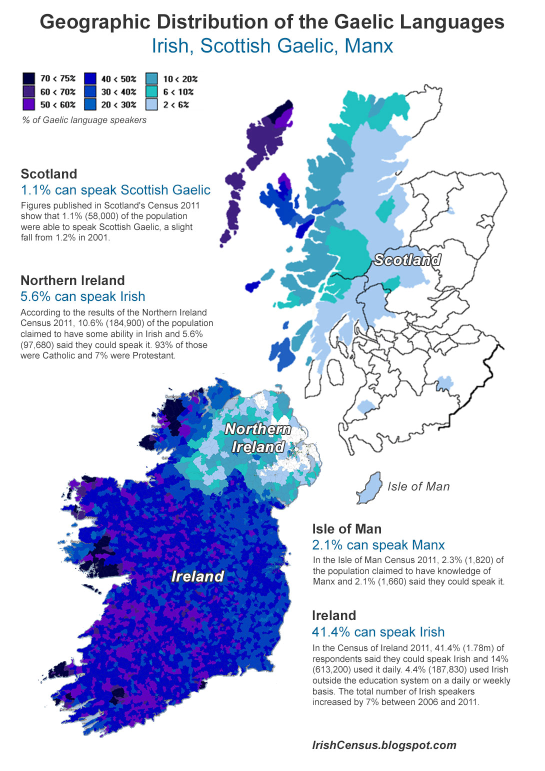 Although the map states that 41% of Irish people surveyed claim they can speak Irish, the number of those who speak it fluently and daily is much smaller, with most of that 41% remembering not more than “cúpla focail” (a few words) of the torment they were required to endure in secondary school. But there is still a fierce pride around the language in some circles, even among the diaspora, which is true of the other Gaelic languages as well – witness the ongoing “Deireadh Seachtaine Gaeilge” (Irish Weekend) held yearly in San Francisco, and the ongoing work by Foras na Gaeilge, among others.