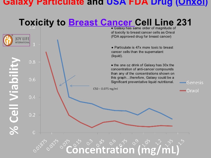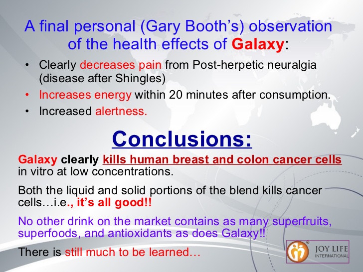 But how is Galaxy juice being represented to their sales force, and hence by the sales force to potential customers? As an anti-cancer agent. Now, if US reps don’t want to run afoul of the FDA, they won’t say anything about that in a direct manner, but have a look at some of the slides from their own inspirational Powerpoint presentation: