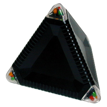This one is called “Luminations,” and it’s not available any longer except on eBay and other such places. It has four start positions, depending on which vertex is pointing up when the beast is turned on, each one more difficult than the last. the object is to get all four vertices glowing red; every time you rotate the puzzle, the vertices change color in a set pattern from off, to green, to yellow, to red. It’s one of my favorites.