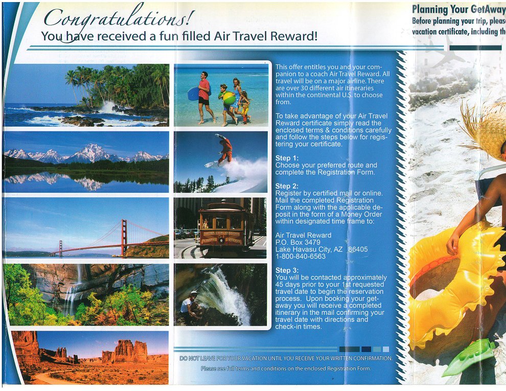 You have received an exciting airfare promotional offer. [Note: Unlike the original postcard, this is not a “complimentary vacation.”] Below you will find the terms and conditions regarding this promotional offer. These terms are important to the processing of your reservation. Please carefully read them in their entirety.