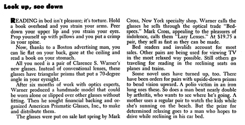This pair is called Bed Prism Spectacles, made by a Chinese outfit and for sale via Amazon.com for $13.05. Given that the original set by Clarence S. Warner sold in 1951 for $19.95, the equivalent of $182.00 today, I’d say that’s a pretty good deal. Of course, it’s hard to tell the quality of these new knockoffs (and there are many, many versions out there), but I know the ones sold by Mark Cross were top-drawer.