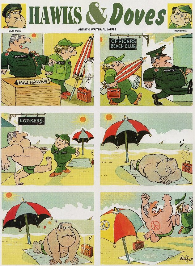 Ever the bellwether of social trends (if only to make fun of them,) Mad magazine featured a recurring segment by Al Jaffee entitled “Hawks and Doves:”