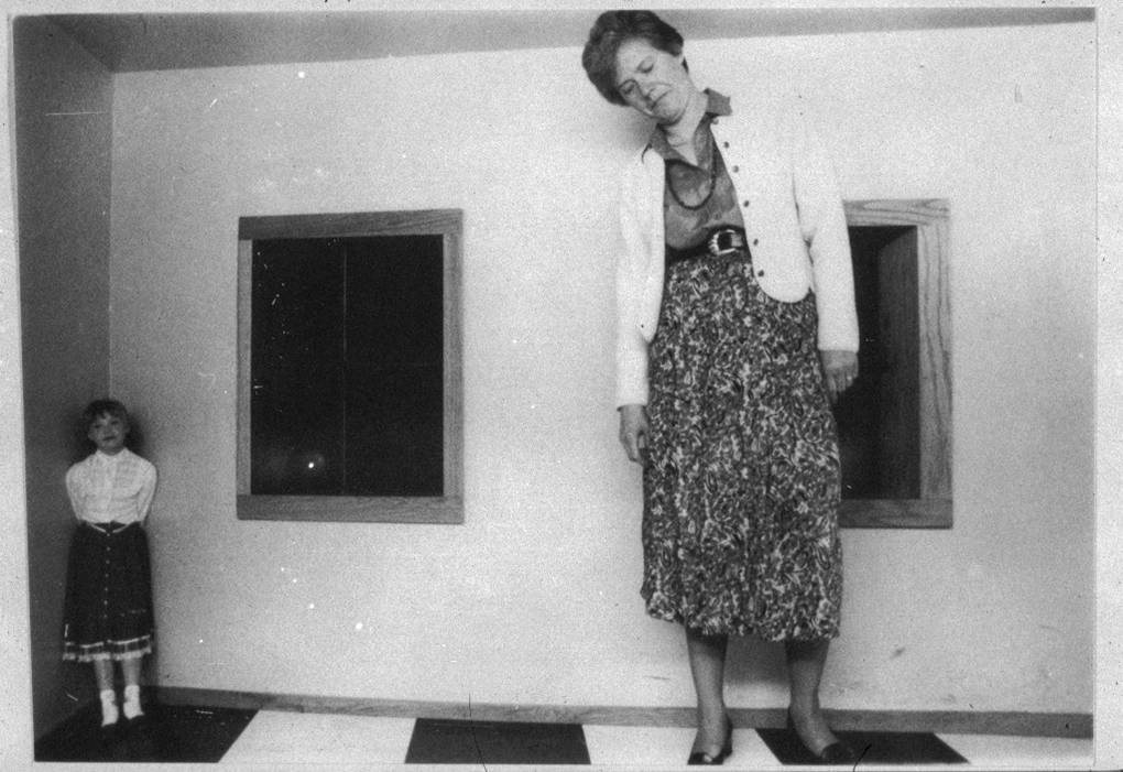 In this common illusion, two people who change places in a room appear to change size drastically. Looking at them through a peephole destroys our sense of depth perception and allows the illusion to work: