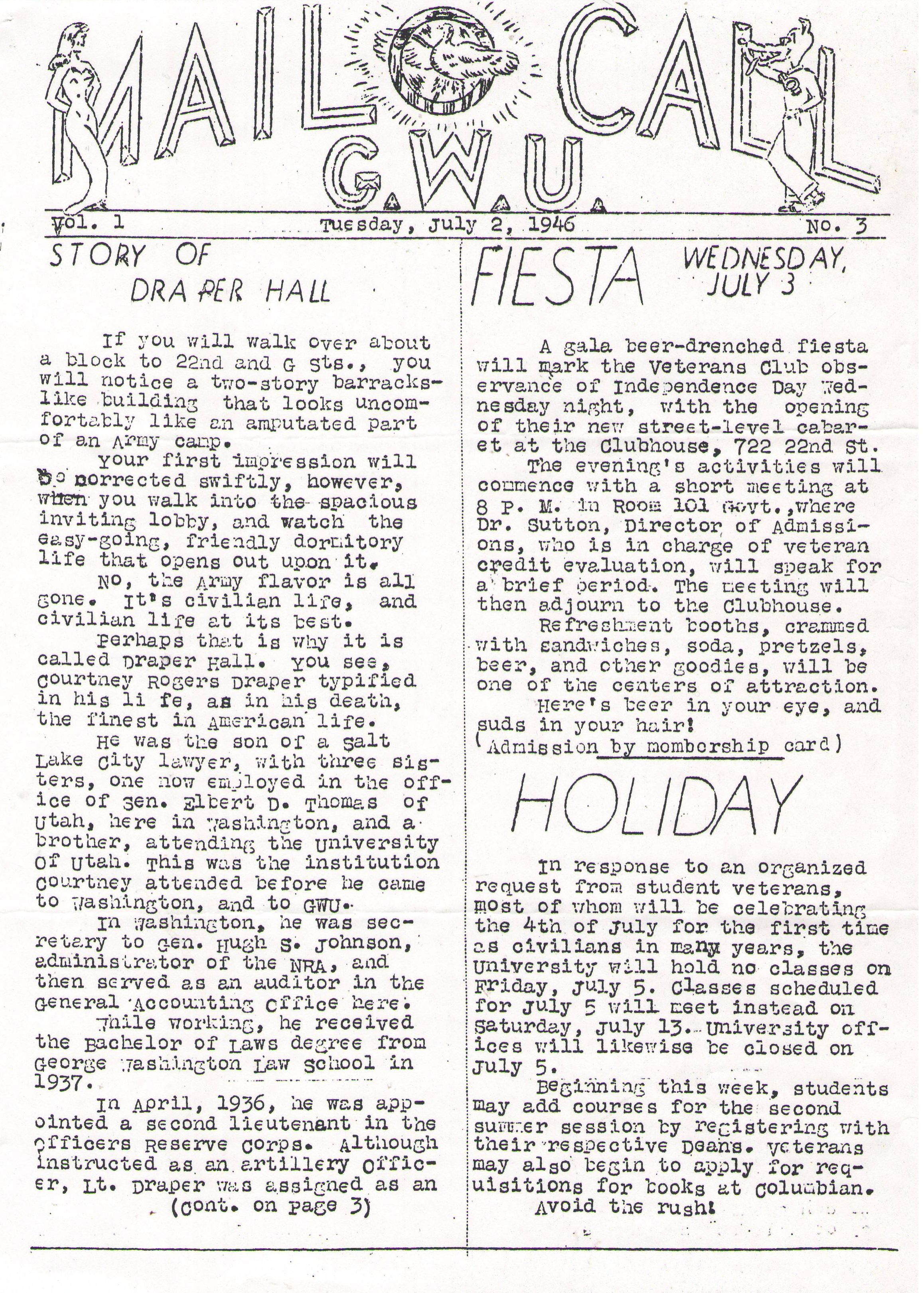 Today, although he is not here to enjoy the fruits of his sacrifice, that spirit in Courtney Rogers Draper which made possible such things as low-cost veterans’ housing and the many other things he would have wanted to see in contemporary America — that spirit is exemplified in the cooperative attitude and the zest for life that you can see in the 126 young fellows who inhabit the 86 rooms of Draper Hall.