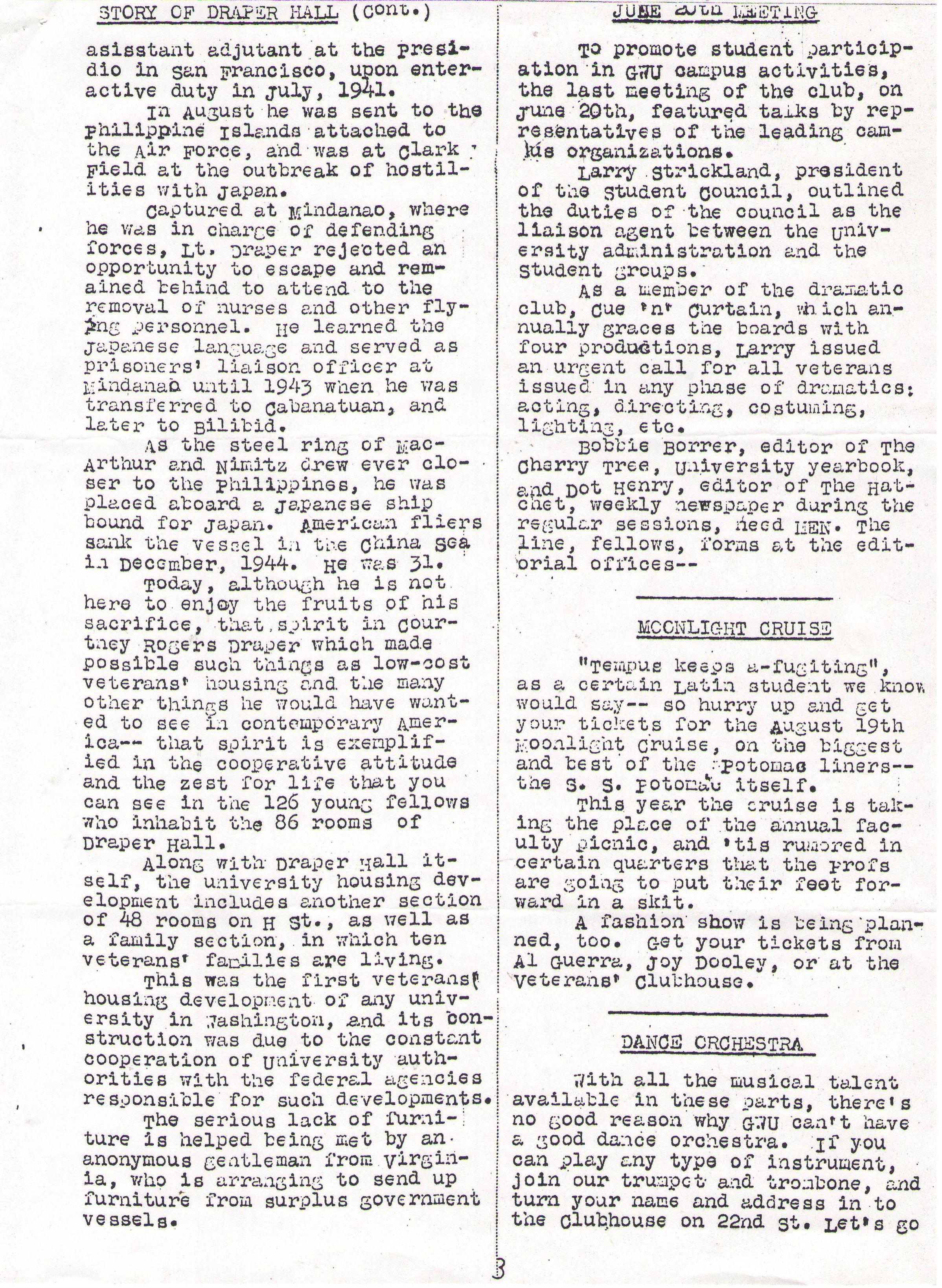 Along with Draper Hall itself, the University housing development includes another section of 48 rooms on H. St., as well as a family section, in which ten veterans’ families are living.