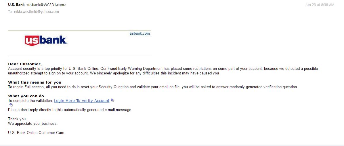 This showed up in a business email account yesterday. Please note, I don’t have an acccount with US Bank, and the “To:” field has an address that is not mine. (click the image to enlarge)