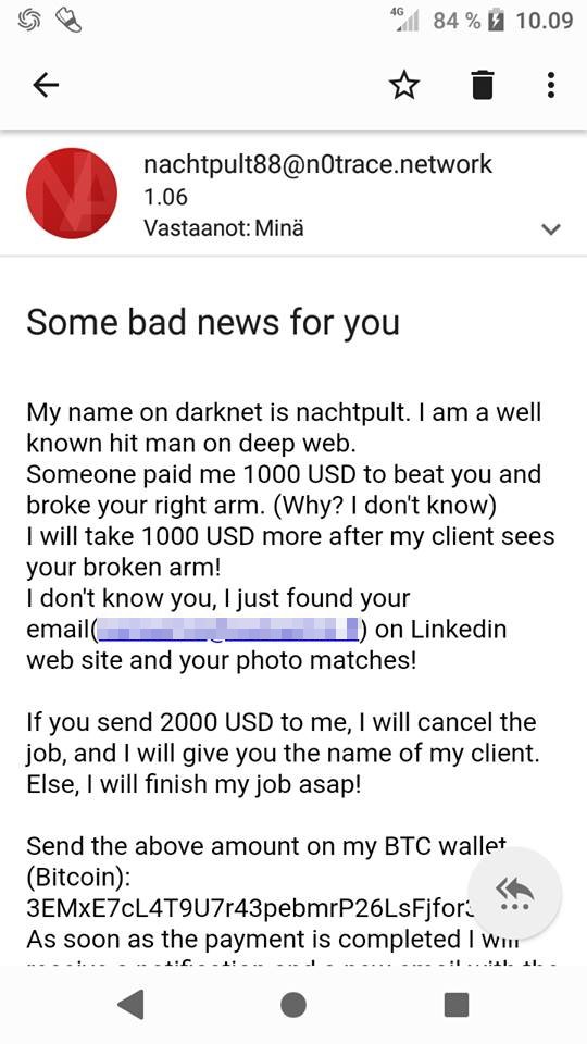 A friend of mine in Finland just got one of these, it falls into the same category as the sextortion scam about which I have already written: desperate bad guys blasting out millions of emails to the entire world, hoping to catch the handful of people who *do* visit adult sites, have unsecured webcams, a guilty conscience, and very little education.