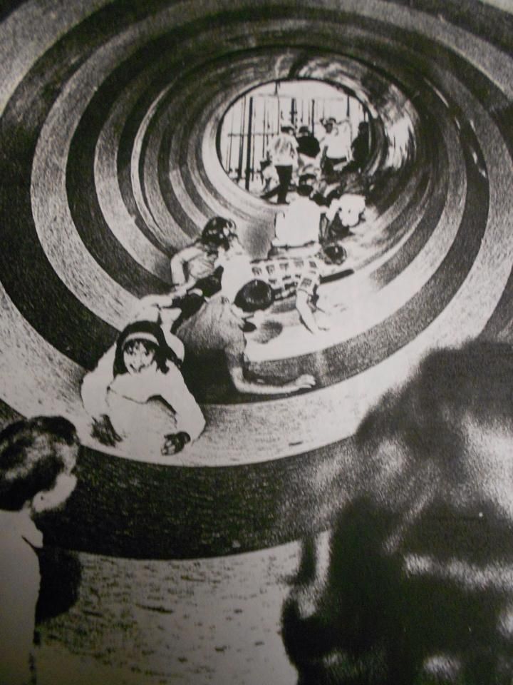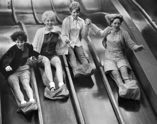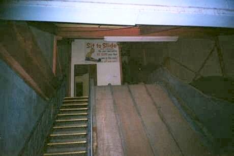 There, you’d pick up your canvas slide, with a pocket in front for your feet, and climb the stairs to the launch platforms – there was one midway up, and one all the way at the top. You were admonished to sit with your legs straight, and off you’d go. There was never any limit to how long you could stay.