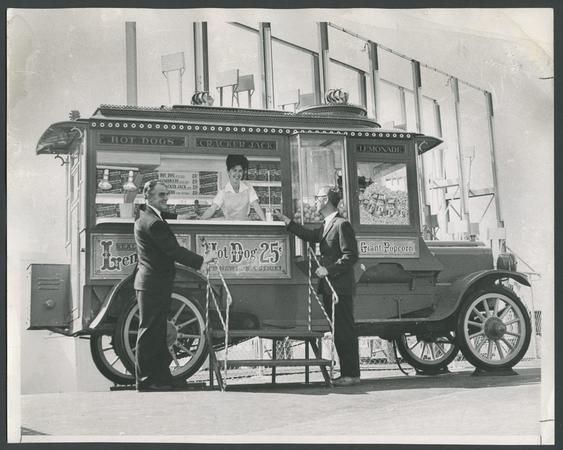 Ranch Kimball and Robert Freed inspect the “new” popcorn cart at Lagoon.