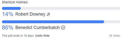 Having recently re-watched the first Holmes movie with Robert Downey, Jr. and having devoured “Sherlock” with Benedict Cumberbatch some time before, I put out a poll to my Facebook circle of friends: Which Holmes did you like best?