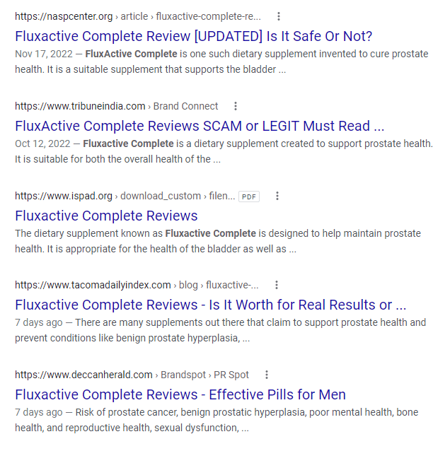 It’s hard for the average consumer to get accurate information about any given product. Go to google and type in “Fluxactive Complete scam or legit” and you’ll get pages and pages of things like this… all placed by affiliate marketers. The bottom line of these pages is “Buy this product now so that I can get a commission on the sale.” And these are the top results, thanks to black-hat SEO techniques which have essentially ruined searches on the internet.