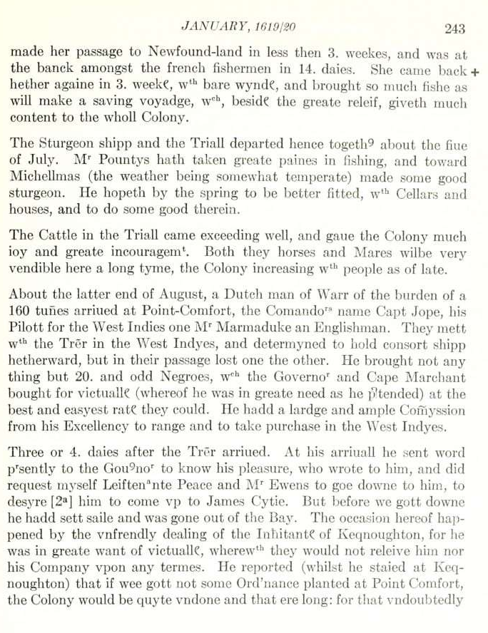 While thinking about John Rolfe’s letter, I kept having flashbacks to elementary school, and of vague memories of learning about the arrival of the Dutch ship in Jamestown. I could have sworn that the text was recorded as “20. and odd negars,” (at that time the word was simply a corruption of the Portuguese word for “black,” and had not yet become the hateful slur of later times). So I started doing some digging, and was intrigued to find that I was not the only one who remembered things erroneously.