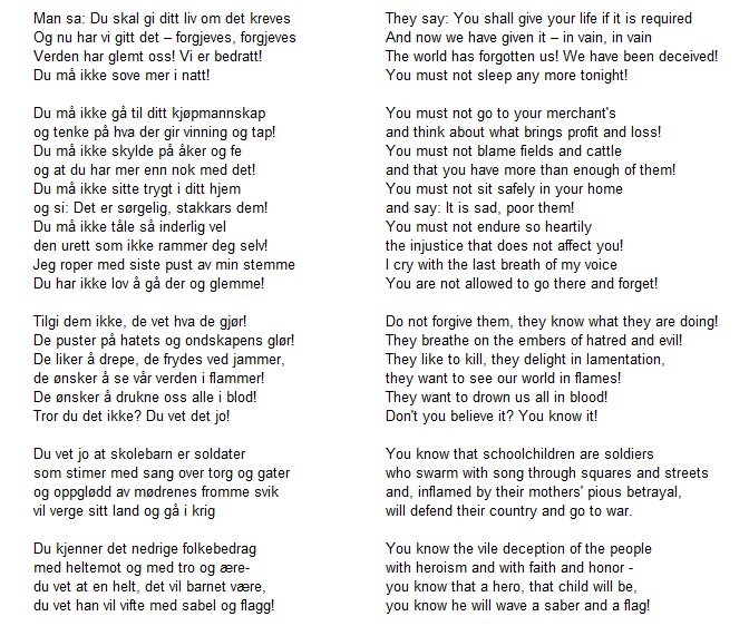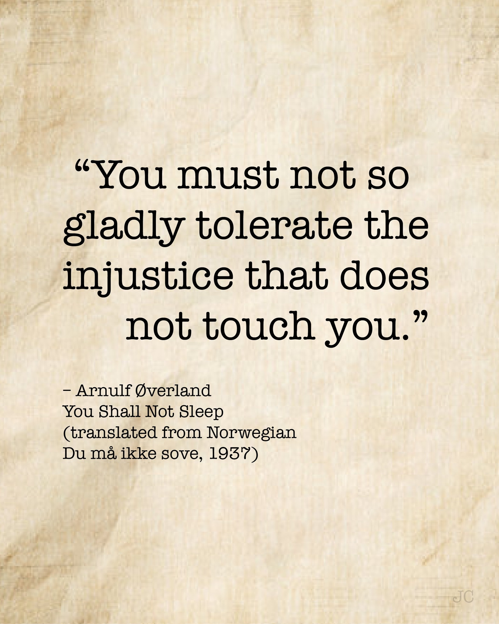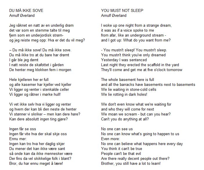 “Arnulf Øverland (1889  1968) was a Norwegian author, poet, and nationalist. “Du må ikke sove” (You Must Not Sleep) was published in 1937, and is seen as a warning against Nazism and what was to come.