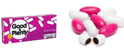 A personal story about Good & Plenty (described by one wag as “Bad and Nasty”): When one of my now-adult granddaughters was around 3, she was wandering around my bedroom and happened across an Ayr ™ inhaler, similar to the ones made by Vicks. You know, those little tubes you cram up your nose and inhale to alleviate sinus stuffiness with eucalyptus and menthol essence. Well, of course she unscrewed it and took a whiff, and her response was “Ew! That’s for old!” It cracked me up, I never forgot it, and it became a by-word in the family. So when a stepdaughter of mine and I had gone out for a “daddy-daughter”date at a movie, we stopped in at Dollar Tree to pick up some forbidden snacks. I chose, of course, Good & Plenty, and of course she responded with “Ew! That’s for old!” She’ll occasionally give me a box as a gift, just to keep the joke going.