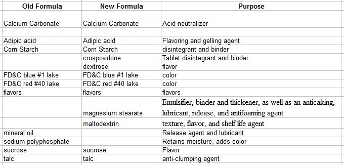 So essentially they added crospovidone, dextrose, magnesium stearate and maltodextrin, and dropped the mineral oil and sodium polyphosphate. No way to tell what changed in the “flavors” category, because they never tell you such things. But in all honesty, the result is the abomination of desolation, and now I’m stuck with 10 bottles of a product that makes me want to gag. I’d rather go back to Rolaids than keep using these.