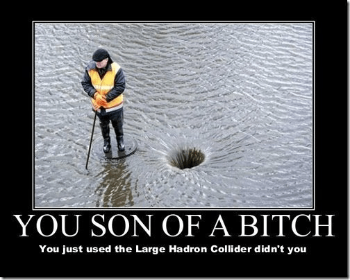 If you’re not sure, the joke here is that some fear the energies generated within the Large Hadron Collider will be great enough to rip a hole in the fabric of space time, or to create a local black hole that will consume the earth. But thus far, this has shown no signs of happening.