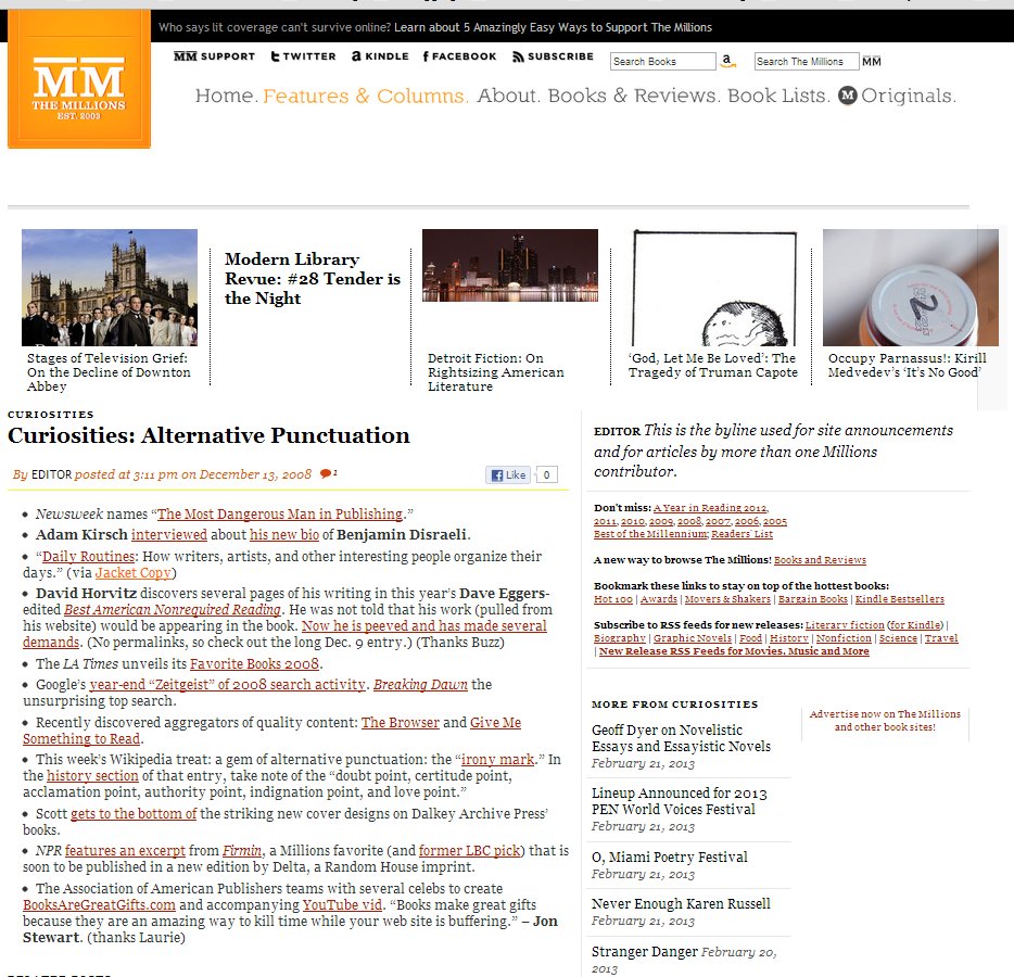 “Here is a perfect example of one of the worst evils of the Internet – aggregators that offer nothing but hqiz , and pollute valid search results. This page has virtually zero to do with alternate punctuation (for example, the interrobang) and instead plugs in an SEO search phrase plus reams of unrelated camel ejecta. Thank you very little.”