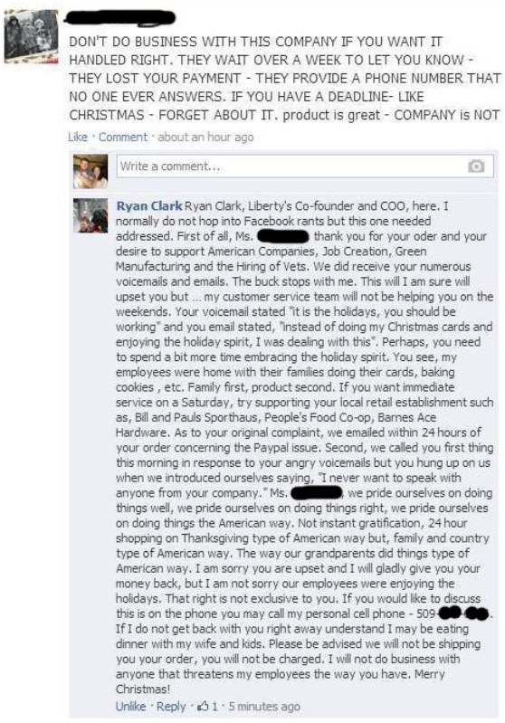 Liberty Bottleworks is an American company that manufactures metal bottles and tries to do so in an ethical and responsible manner. Have a look at a rant from a disgruntled customer and the response she got from the company co-founder and COO: