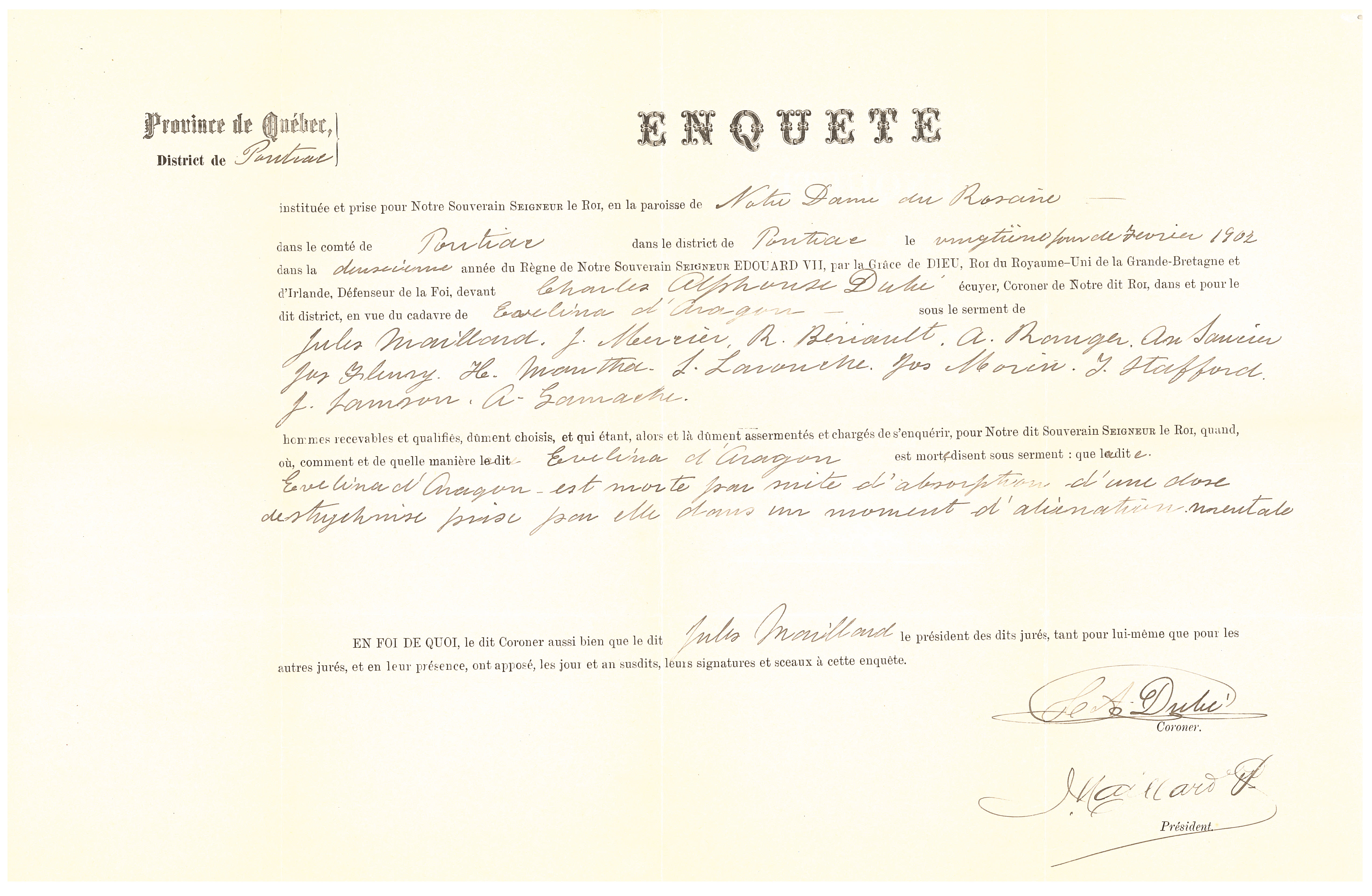 On February 20, 1902, coroner Charles Alphonse Dubé met with several witnesses at Notre-Dame-du-Rosaire in the Pontiac district. He wanted to determine the cause of the death of Mrs. Evelina d’Aragon, found dead in bed. After investigation, he concluded that the latter committed suicide by taking a dose of strychnine “in a moment of insanity.”
