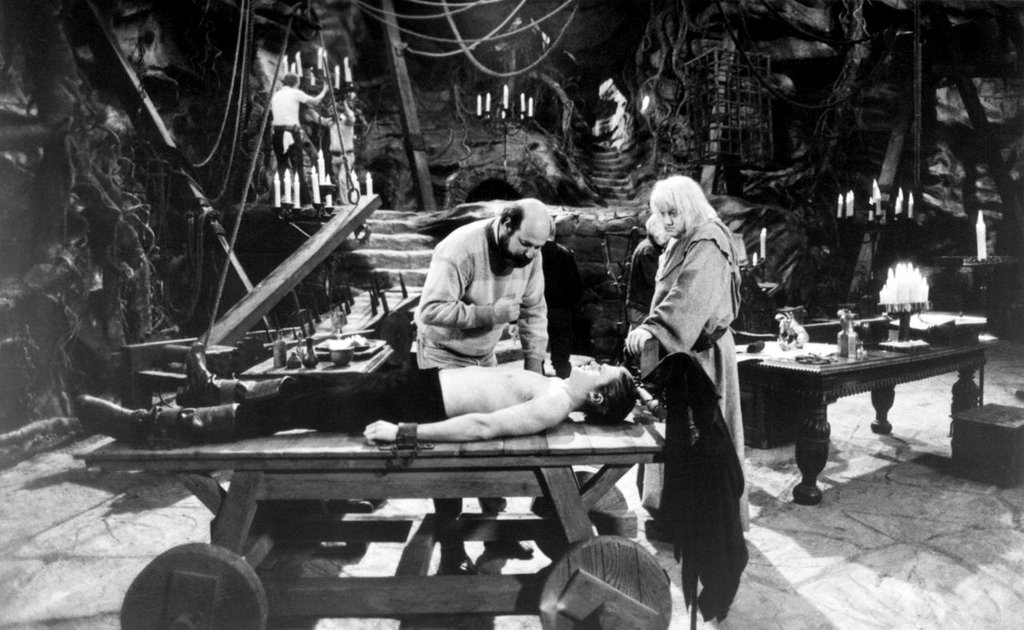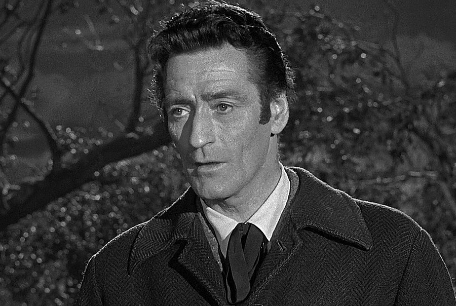 Guy Rolfe stars as Mr. Sardonicus, a wicked and wealthy count (once a poor peasant who won a fortune in a lottery) whose face was frozen into a hideous grin from the shock of seeing his father’s rotting corpse. Sardonicus hires Sir Robert Cargrave (played by Ronald Lewis), a brilliant doctor who has had great success with muscle massage techniques, to help him. Complicating the matter is the fact that Sardonicus’ wife Maude is Robert Cargrave’s old love. Cargrave travels to Sardonicus’ castle and is met by the dedicated servant Krull, who has a badly-scarred eye. During the course of the visit, Sardonicus explains what happened to him, and threatens to torture his wife (the way he had earlier tortured Krull) if Cargrave will not help him. Cargrave agrees, but even when a highly-radical treatment is a success, Sardonicus is not freed from his torment; in fact, William Castle appears and asks the audience to hold up their glow-in-the-dark cards to indicate mercy or punishment. Regardless of the vote, it appears that the audience has voted for punishment, and the movie ends with Sardonicus facing additional horrors for his evil, horrors administered in part by Krull, who takes the opportunity for a little revenge of his own.