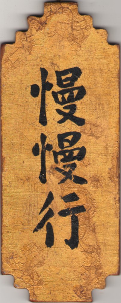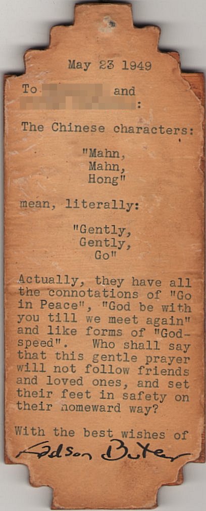 The hanzi (慢慢行) on the front read “mahn mahn hong” in Cantonese, or “Màn man xíng” in Mandarin. Butler’s translation, “gently, gently go” is accurate – 慢 is “slowly,” and 行 means “go” or “travel.” Other translations have been rendered as “take it easy” or “take care.” The sentiment extended to a visitor who is leaving your home is the same, regardless of how you read it, and brings to mind the gentleness of the well-known “Irish blessing:”
