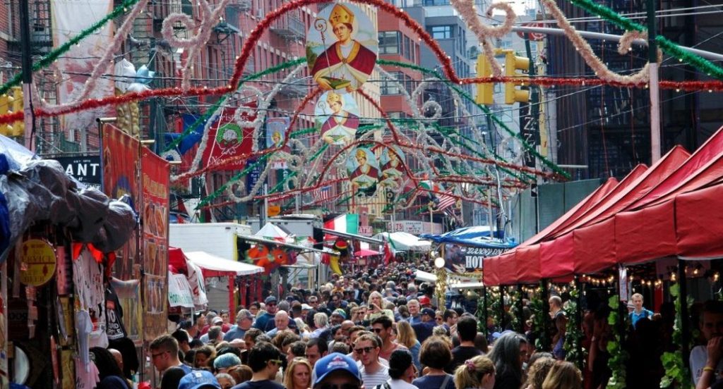 Anyone who has seen “The Godfather, Part II” is familiar with the street festival during which Vito Corleone assassinates Don Fanucci. This is a portrayal based on the Festa di San Gennaro (The Feast of St. Januarius) which was brought to New York by immigrants from Naples in 1926 as a continuation of the celebration of their patron Saint. Originally a one-day celebration, the Festa continues to this day as an 11-day extravaganza (except in 2020, when it was cancelled due to the Covid outbreak); activities include Italian street food, sausages, zeppole (fried dessert balls otherwise known as “Italian doughnuts”), games of chance (often dishonest¹), music, cannoli-eating contests, vendors, parades, and the grand procession honoring the patron saint – the tradition of attaching money to the statue continues, with the funds designated to be used for the poor. In the past it has been a major tourist attraction, and hopefully it will be once again when the pandemic madness has passed.