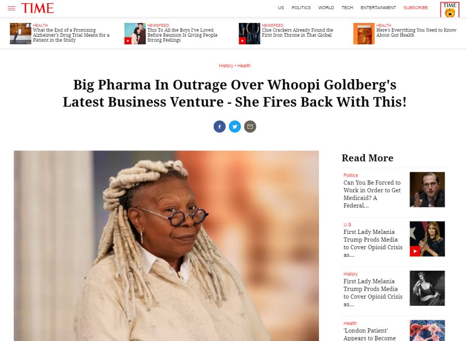 The advertisement is designed to look like a Time Magazine article. It’s not. And Ms. Goldberg does not promote or endorse this product. At all. In any way. The whole thing is made up out of whole cloth as an affiliate marketing scam to get you to the marketing page for this questionable product. ¹