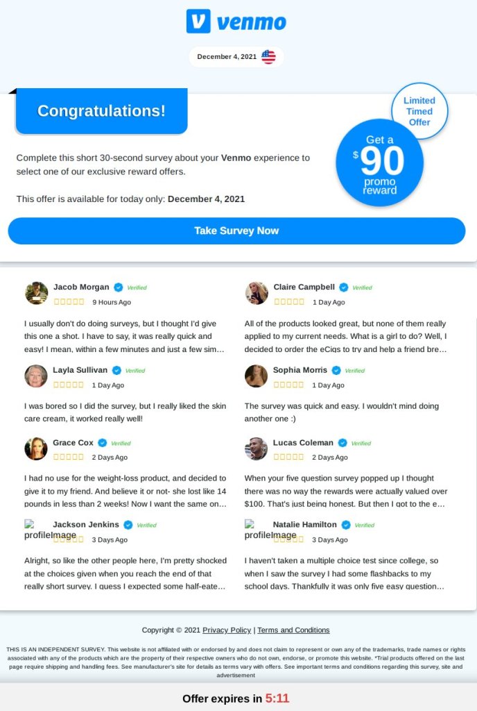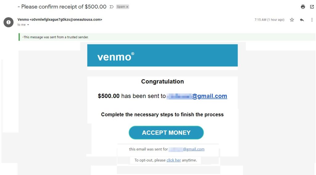 Red flag #1: This message is not from Venmo. The email address of the sender is “0vmlwfglxague7g0kzs@oneautousa.com” which is not a venmo address; the domain leads to an essentially empty storefront of a generic “church.” Either the domain was created for the purpose of scamming people, or an otherwise unrelated domain was hijacked to have malicious content injected into its directory structure, or the email address was simply spoofed. In any case, it’s a clear indication that this email is not from Venmo.