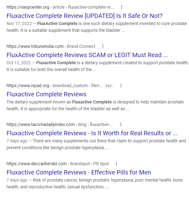 It’s hard for the average consumer to get accurate information about any given product. Go to google and type in “Fluxactive Complete scam or legit” and you’ll get pages and pages of things like this… all placed by affiliate marketers. The bottom line of these pages is “Buy this product now so that I can get a commission on the sale.” And these are the top results, thanks to black-hat SEO techniques which have essentially ruined searches on the internet.