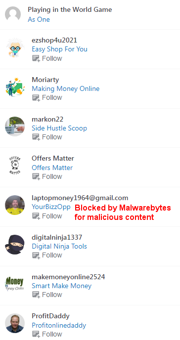 Every single one of these is a sleazy-looking marketing website. By following my blog, I assume they hope either a) I will follow them back, or b) this will somehow raise their rankings in Google or other search engines. A few examples of what you find if you happen to click their links: