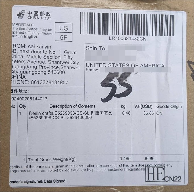 The label shows clearly that it was shipped directly from China. The whole series of notifications from “shipping@24hservice.vip” was a bunch of computer-generated nonsense. We paid nearly $40.00 for a cheaply-made, cheaply painted resin piece of garbage that isn’t worth $3.95.